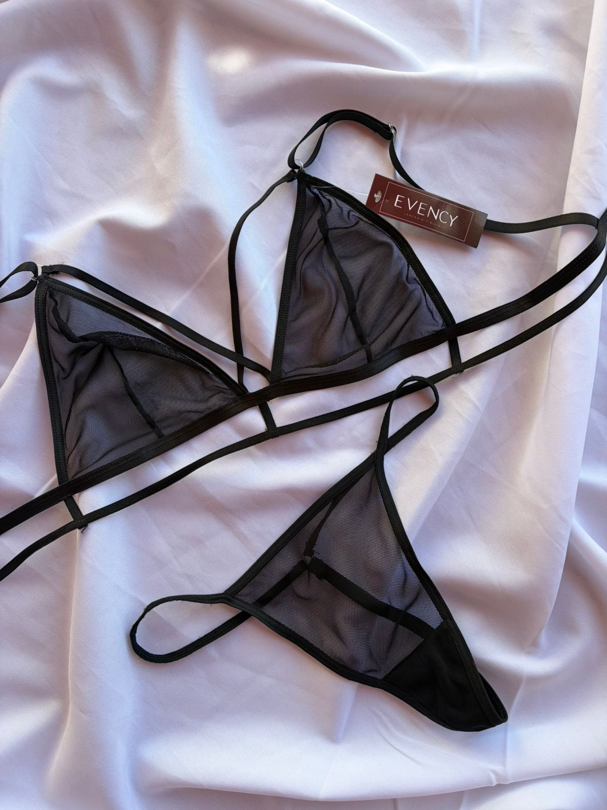 Delicadeza y sensualidad en una sola prenda. Este conjunto está confeccionado en suave microtul translúcido que realza la silueta con un toque sofisticado. El bralette cuenta con un diseño triangular, bajo busto reforzado para mejor sujeción y un detalle único de doble tira que enmarca el escote. La bombacha tipo hilo ofrece un calce sensual y cómodo.