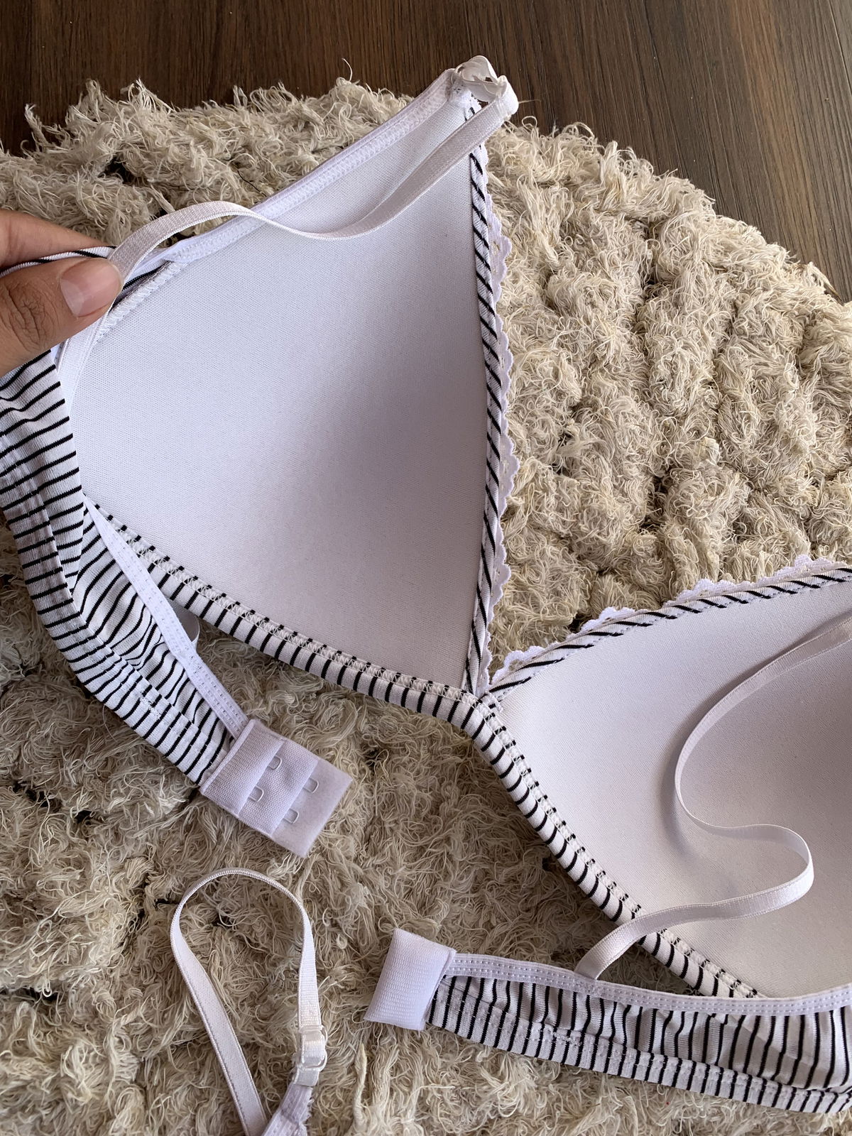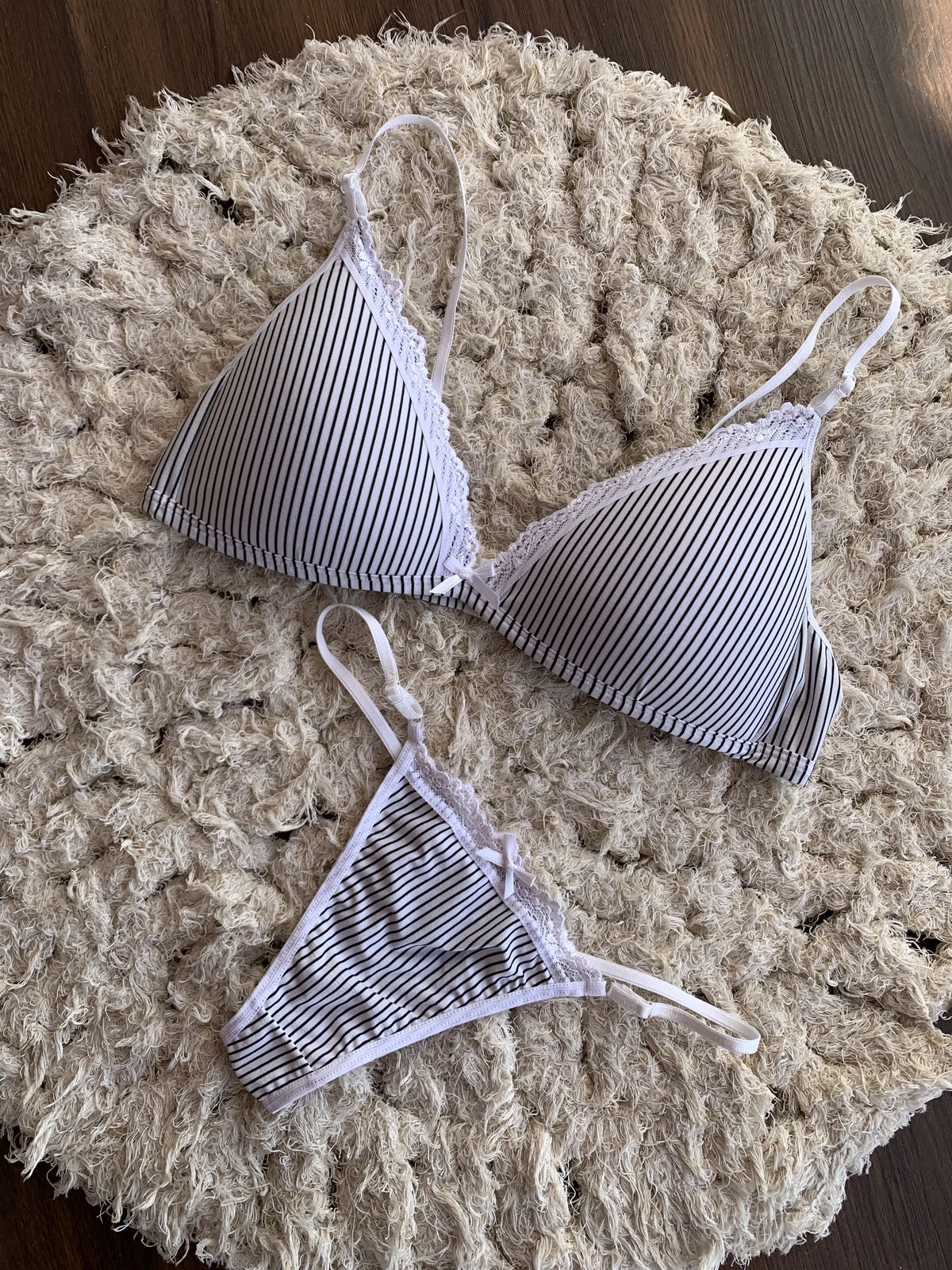 Dale un toque fresco y coqueto a tu colección con este conjunto de lencería en verde menta con rayas negras. El bralette sin aros es súper cómodo y tiene detalles de encaje negro que le dan ese extra sexy sin perder la onda relajada. La parte de abajo hace juego y tiene tiritas ajustables para que te quede justo como te gusta.