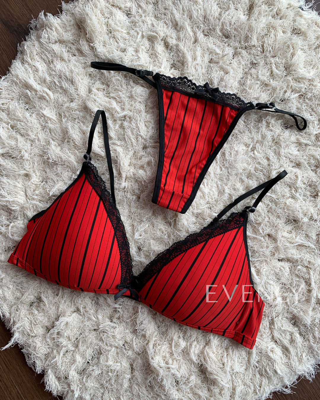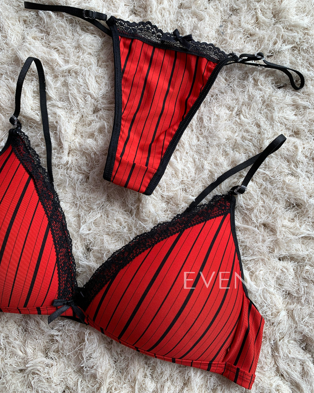 Dale un toque fresco y coqueto a tu colección con este conjunto de lencería en verde menta con rayas negras. El bralette sin aros es súper cómodo y tiene detalles de encaje negro que le dan ese extra sexy sin perder la onda relajada. La parte de abajo hace juego y tiene tiritas ajustables para que te quede justo como te gusta.
