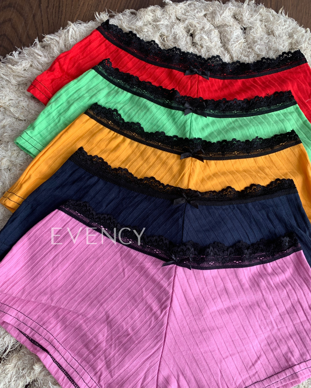 El short es amplio, con cintura elástica (¡comodidad ante todo!), también con detalle de encaje en la parte de arriba y un mini moño al frente para combinar con el top.
