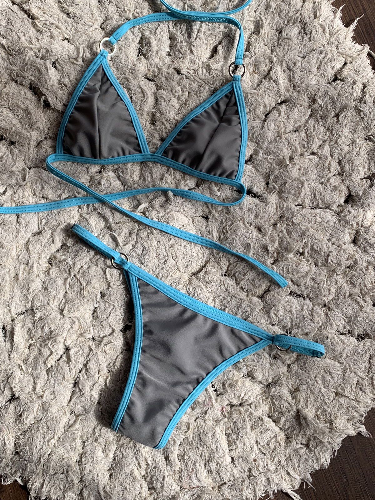Microbikini clásica con toque trendy. Top triangular regulable y bombacha colaless con aritos metálicos.