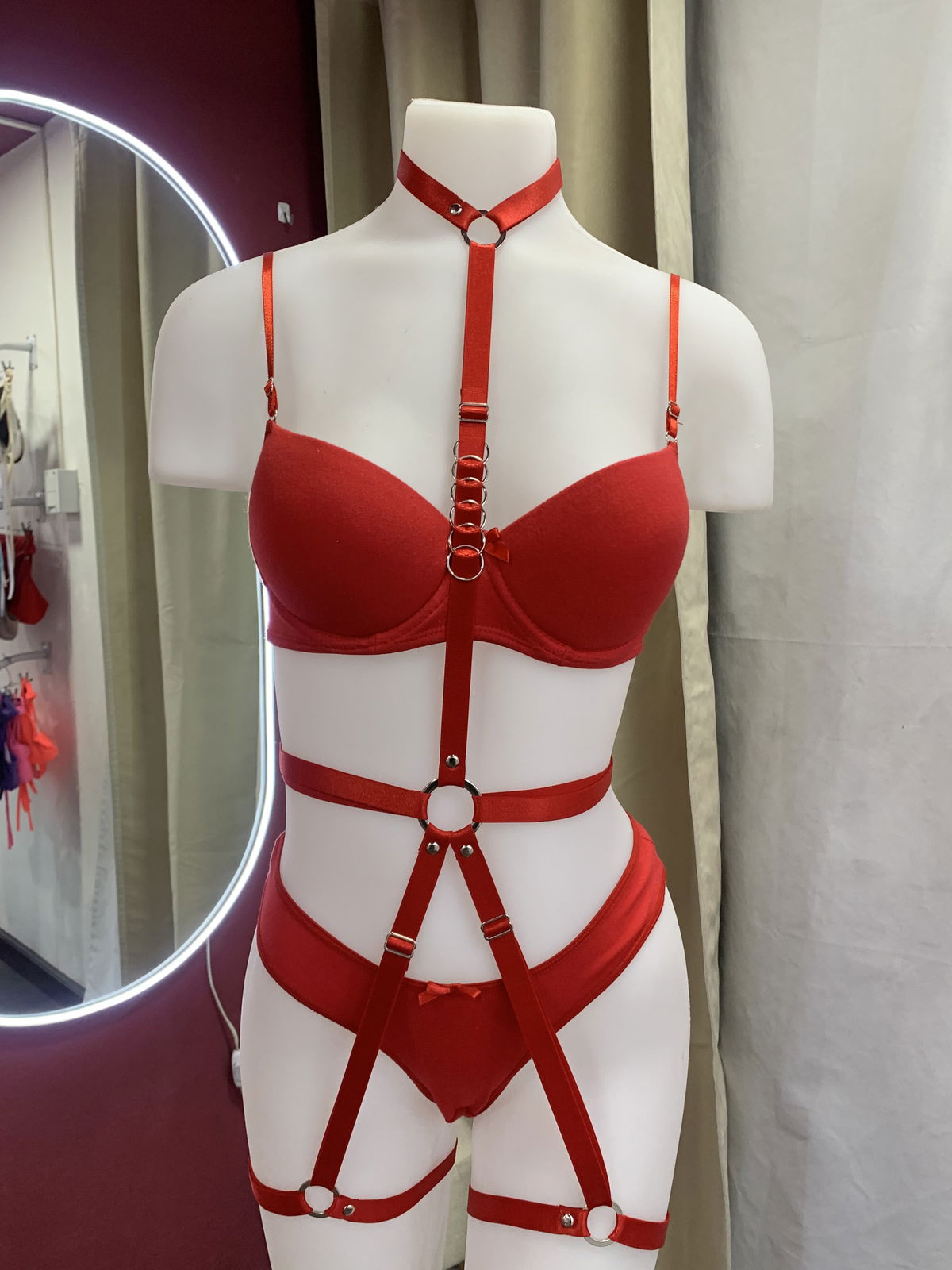 Un arnés que resalta cada curva con actitud. Con tiras regulables en cuello, torso, piernas y muslos, y detalles metálicos que suman un toque de estilo y poder
